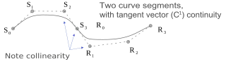 Two Bézier curve segments attached in such a way that they are C1 continuous