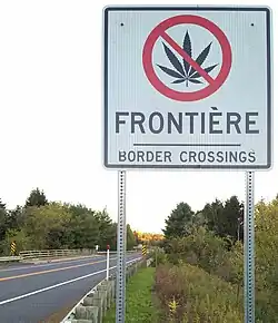 Road sign at the Canada-US border prohibiting cannabis, Abercorn, Québec (2018)