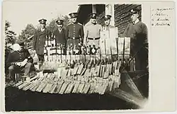 Illegal alcohol in confiscation, Finnish policemen and preventive officers on background. Prohibitory law against trade of alcoholic beverages ("kieltolaki") was in force during years 1919–1932 in Finland.
