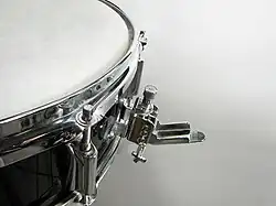 The snares can be thrown off (disengaged) with a lever on the strainer so that the drum produces a sound reminiscent of a tom-tom.[2] Rimshots are a technique associated with snare drums in which the head and rim are struck simultaneously with one stick (or in orchestral concert playing, a stick placed on the head and the rim struck by the opposite stick). In contemporary and/or pop and rock music, where the snare drum is used as a part of a drum kit, many of the backbeats and accented notes on the snare drum are played as rimshots, due to the ever-increasing demand for their typical sharp and high-volume sound.