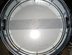 The snare drum originates from the tabor, a drum first used to accompany the flute. The tabor evolved into more modern versions, such as the kit snare (the type usually included in a drum kit), marching snare, tarol snare, and piccolo snare.[1] Each type is a different size, and there are different playing styles associated with each of them. The snare drum that one might see in a popular music concert is usually used in a backbeat style. In marching bands, it can do the same but is used mostly for a front beat. In comparison with the marching snare, the kit snare is generally smaller in length, while the piccolo is the smallest of the three. The snare drum is easily recognizable by its loud cracking sound when struck firmly with a drumstick or mallet. The depth of the sound varies from one drum to another because of the different techniques and construction qualities of the drum. Some of these qualities are head material and tension, dimensions, and rim and drum shell materials and construction.