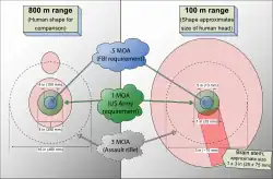 A 2008 United States military market survey for a Precision Sniper Rifle (PSR) called for 1 MOA (0.3 mrad) extreme vertical spread for all shots in a 5-round group fired at targets at 300, 600, 900, 1,200 and 1,500 meters.[25][26] In 2009, a United States Special Operations Command market survey called for a 1 MOA (0.28 mrad) extreme vertical spread for all shots in a 10-round group fired at targets at 300, 600, 900, 1,200, and 1,500 meters.[27][28] The 2009 Precision Sniper Rifle requirements state that the PSR, when fired without a suppressor, shall provide a confidence factor of 80% that the weapon and ammunition combination is capable of holding 1 MOA (0.28 mrad) extreme vertical spread, calculated from 150 ten-round groups that were fired unsuppressed. No individual group was to exceed 1.5 MOA (0.42 mrad) extreme vertical spread. All accuracy was taken at the 1,500 meter point.[29][30]