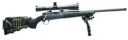 A sniper rifle is a high-precision, long-range rifle. Requirements include high accuracy, reliability, mobility, concealment, and optics, for anti-personnel, anti-materiel and surveillance uses by military snipers. The modern sniper rifle is a portable shoulder-fired rifle with either a bolt action or semi-automatic action, fitted with a telescopic sight for extreme accuracy and chambered for a high-ballistic performance centerfire cartridge.
