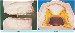 Dental appliances are common treatments for snoring. They may be custom made, which requires an impression of the teeth and construction in a dental laboratory, or they may be bought over the counter without involvement of a dental health professional. The latter type are often "boil and bite" appliances which come in a set size. The appliance is immersed in boiling water and then the individual bites into appliance with the jaw in a protruded position. Oral appliances may be titratable (adjustable) or non-titratable (one fixed position).[7] In general, oral appliances are cheap and non-invasive.[12] They can be combined with CPAP treatment.[12] Complications include discomfort, excessive salivation (drooling),[12] insomnia,[12] pain in the periodontal ligament of teeth if they are under excessive force, pain in the temporomandibular joint[12] and muscles of mastication (e.g. temporalis), and jaw dislocation.[12] Some devices prevent anterior oral seal, and therefore cause mouth breathing with the associated problems like dry mouth.[12] A device which covers only some of the teeth and leaves others uncovered may potentially have a Dahl effect, leading to undesired movement of the teeth and creating problems like open bite.[12] Therefore, a dentist should regularly review individuals who are using dental appliances for snoring.[7]