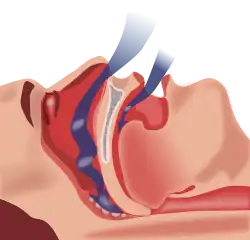 | The soft palate and the base of tongue obstruct the airway in a person sleeping on their back. Snoring is one of the major symptoms of obstructive sleep apnea, although it may occur without any sleep apnea or other medical conditions. | |