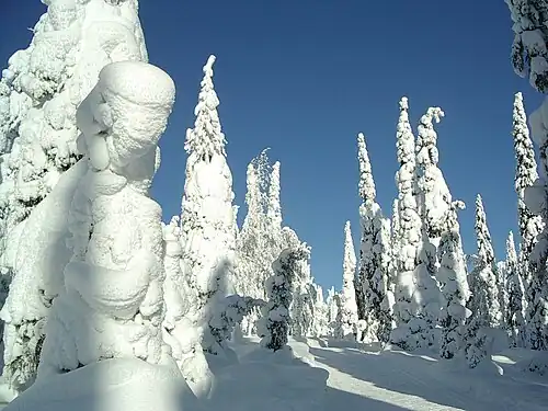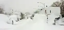 Snow flurry, snow shower, snow storm and blizzard describe snow events of progressively greater duration and intensity.[37] A blizzard is a weather condition involving snow and has varying definitions in different parts of the world. In the United States, a blizzard occurs when two conditions are met for a period of three hours or more: a sustained wind or frequent gusts to 35 miles per hour (16 m/s), and sufficient snow in the air to reduce visibility to less than 0.4 kilometers (0.25 mi).[38] In Canada and the United Kingdom, the criteria are similar.[39][40] While heavy snowfall often occurs during blizzard conditions, falling snow is not a requirement, as blowing snow can create a ground blizzard.[41]