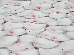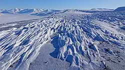 According to the International Association of Cryospheric Sciences, snow metamorphism is "the transformation that the snow undergoes in the period from deposition to either melting or passage to glacial ice".[4] Starting as a powdery deposition, snow becomes more granular when it begins to compact under its own weight, be blown by the wind, sinter particles together and commence the cycle of melting and refreezing. Water vapor plays a role as it deposits ice crystals, known as hoar frost, during cold, still conditions.[57] During this transition, snow "is a highly porous, sintered material made up of a continuous ice structure and a continuously connected pore space, forming together the snow microstructure". Almost always near its melting temperature, a snowpack is continually transforming these properties wherein all three phases of water may coexist, including liquid water partially filling the pore space. After deposition, snow progresses on one of two paths that determine its fate, either by ablation (mostly by melting) from a snowfall or seasonal snowpack, or by transitioning from firn (multi-year snow) into glacier ice.[4]