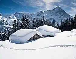 Orographic or relief snowfall is created when moist air is forced up the windward side of mountain ranges by a large-scale wind flow. The lifting of moist air up the side of a mountain range results in adiabatic cooling, and ultimately condensation and precipitation. Moisture is gradually removed from the air by this process, leaving drier and warmer air on the descending, or leeward, side.[14] The resulting enhanced snowfall,[15] along with the decrease in temperature with elevation,[16] combine to increase snow depth and seasonal persistence of snowpack in snow-prone areas.[1][17]
