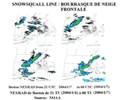 A cold front, the leading edge of a cooler mass of air, can produce frontal snowsqualls—an intense frontal convective line (similar to a rainband), when temperature is near freezing at the surface. The strong convection that develops has enough moisture to produce whiteout conditions at places which the line passes over as the wind causes intense blowing snow.[8] This type of snowsquall generally lasts less than 30 minutes at any point along its path, but the motion of the line can cover large distances. Frontal squalls may form a short distance ahead of the surface cold front or behind the cold front where there may be a deepening low-pressure system or a series of trough lines which act similar to a traditional cold frontal passage.[9]