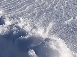 Fresh snow beginning to metamorphose: The surface shows wind packing and sastrugi. In the foreground are hoar frost crystals, formed by refrozen water vapor emerging to the cold surface.