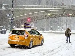 New York City during a 2016 blizzard, which produced strong winds and record-breaking snowfall.