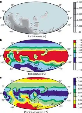 - ^ a b Hyde, William T.; Crowley, Thomas J.; Baum, Steven K.; Peltier, W. Richard (May 2000). "Neoproterozoic 'snowball Earth' simulations with a coupled climate/ice-sheet model". Nature. 405 (6785): 425–429. Bibcode:2000Natur.405..425H. doi:10.1038/35013005. PMID 10839531. S2CID 1672712.