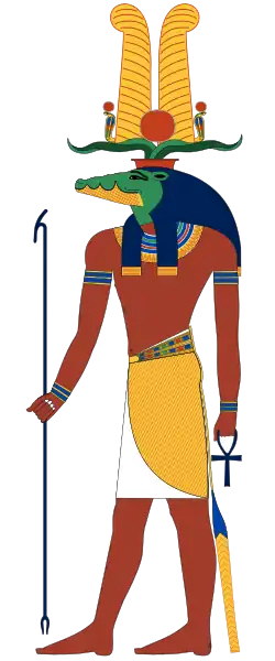 ![]() Sobek, often depicted with the head of a crocodile and a crown composed of ram horns, a sun disk, and feathered plumes. | |||||