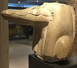 Though Sobek was worshipped in the Old Kingdom, he truly gained prominence in the Middle Kingdom (c. 2055–1650 BCE), most notably under the Twelfth Dynasty pharaoh, Amenemhat III. Amenemhat III had taken a particular interest in the Faiyum of Egypt, a region heavily associated with Sobek. Amenemhat and many of his dynastic contemporaries engaged in building projects to promote Sobek – projects that were often executed in the Faiyum. In this period, Sobek also underwent an important change: he was often fused with the falcon-headed god of divine kingship, Horus. This brought Sobek even closer with the kings of Egypt, thereby giving him a place of greater prominence in the Egyptian pantheon.[9] The fusion added a finer level of complexity to the god's nature, as he was adopted into the divine triad of Horus and his two parents: Osiris and Isis.[10]