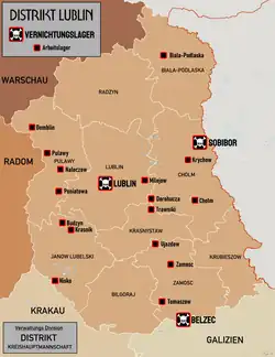 Sobibor was one of four extermination camps established as part of Operation Reinhard, the deadliest phase of the Holocaust.[2] The extermination of Europe's Jews did not originate as a single top-down decision, but was rather a patchwork of decisions made regarding particular occupied areas.[3] Following the invasion of Poland in September 1939, the Germans began implementing the Nisko Plan in which Jews were deported from ghettos across Europe to the forced labour camps which comprised the Lublin Reservation. Lublin District region was chosen in particular for its inhospitable conditions.[4] The Nisko Plan was abandoned in 1940 but many forced labour camps continued operations in the area, including Trawniki, Lipowa 7, and Dorohucza.[4][5]