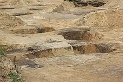 After the killing in the gas chambers, the corpses were collected by Sonderkommandos and taken to mass graves or cremated in the open air.[174] The burial pits were 50–60 metres (160–200 ft) long, 10–15 metres (33–49 ft) wide, and 5–7 metres (16–23 ft) deep, with sloping sandy walls in order to facilitate the burying of corpses.[175]