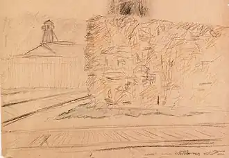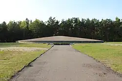 The camp incorporated several pre-war buildings including a post office, a forester's lodge, a forestry tower, and a chapel.[14] The forester's lodge became the camp administration building, while the post office was used as lodging for the SS (though not, as commonly reported, for the commandant).[15] The former post office, located near the railroad tracks, still stands today.[16][14] The SS adapted the preexisting railroad infrastructure, adding an 800-meter railroad spur that ended inside the camp. This third set of tracks allowed regular rail traffic to continue uninterrupted while the camp unloaded transports of new prisoners.[13] Some building materials were supplied by the SS Central Construction Office in Lublin, while others were procured from local sawmills and brickworks, as well as from the remains of demolished houses of Jews.[16][17]