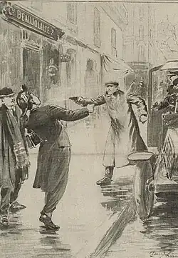 On 21 December 1911, the illegalist anarchist Bonnot Gang attacked Ernest Caby, a Société Générale courier responsible for transporting daily funds to the rue Ordener agency in Paris.[16][17] In search of money, Raymond Callemin and Octave Garnier shot him down, stole the money he was carrying, and then fled with Jules Bonnot in a stolen luxury car.[17] This attack, known as the Ordener attack, was the gang's first robbery and the first motorized bank heist in history.[16][18]