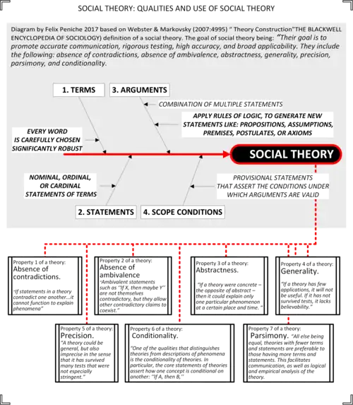 Theory construction, according to The Blackwell Encyclopedia of Sociology, is instrumental: "Their goal is to promote accurate communication, rigorous testing, high accuracy, and broad applicability. They include the following: absence of contradictions, absence of ambivalence, abstractness, generality, precision, parsimony, and conditionality."[8] Therefore, a social theory consists of well-defined terms, statements, arguments and scope conditions.