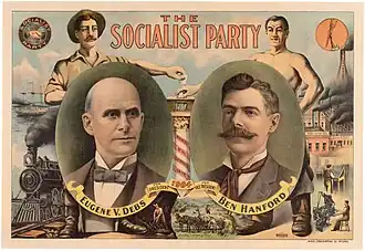 From 1901 to the onset of World War I, the Socialist Party had numerous elected officials throughout the United States. The Mapping Social Movements Project has identified more than 1,000 elected Party members in 353 cities and towns.[8] There were two Socialist members of Congress, Meyer London of New York City and Victor Berger of Milwaukee (a part of the sewer socialism movement, a major front in socialism, Milwaukee being the first major city to elect a socialist mayor, which it did four times between 1910 and 1956); over 70 mayors; and many state legislators and city councilors. The party was able to successfully run candidates in smaller municipalities as well as big cities, winning the mayoralty of Butte, Montana, with Lewis Duncan and that of Schenectady, New York, with George R. Lunn.[9] Its voting strength was greatest among recent Jewish, Finnish and German immigrants, coal miners and former populist farmers in the Midwest.[10] According to Jimmy Weinstein, its electoral base was strongest west of the Mississippi River, "in the states where mining, lumbering, and tenant farming prevailed". It was also able to attract support from railroad workers. Its vote shares were highest in Oklahoma, Nevada, Montana, Washington, California, Idaho, Florida, Arizona and Wisconsin, and it also attracted support in Texas, Arkansas and Kansas.[9] From 1900 (before its formal union) to 1912, it ran Eugene V. Debs for president at each election. The best showing ever for a socialist ticket was in 1912, when Debs gained 901,551 total votes, 6% of the popular vote. In 1920, Debs ran again, this time while imprisoned for opposing World War I, and received 913,693 votes, 3.4% of the total.