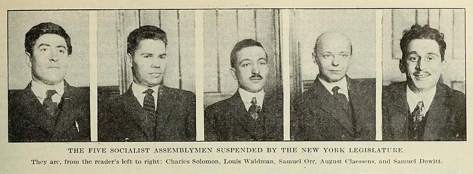 On January 7, 1920, less than a week after the Palmer Raids had swept and stunned the country, the New York Assembly was called to order. The majority Republicans easily elected their candidate for the Speaker, Thaddeus C. Sweet and after opening day formalities the body took a brief recess. Back in session, Sweet declared: "The Chair directs the Sergeant-at-Arms to present before the bar of the House Samuel A. DeWitt, Samuel Orr, Louis Waldman, Charles Solomon, and August Claessens", the Assembly's five Socialist members.