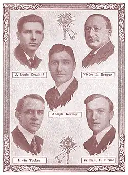 (L-R): Jasper McLevy, Morris Hillquit, James Oneal, Norman Thomas, James H. Maurer, Lilith Martin Wilson, William H. Henry, George E. Roewer.