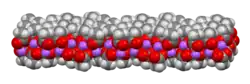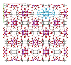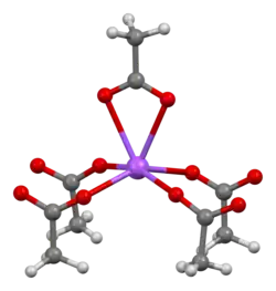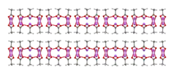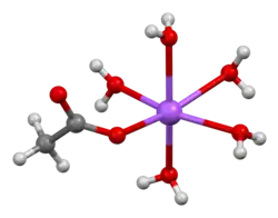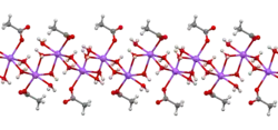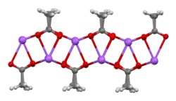 The crystal structure of anhydrous sodium acetate has been described as alternating sodium-carboxylate and methyl group layers.[18] Sodium acetate trihydrate's structure consists of distorted octahedral coordination at sodium. Adjacent octahedra share edges to form one-dimensional chains. Hydrogen bonding in two dimensions between acetate ions and water of hydration links the chains into a three-dimensional network.[19][20]