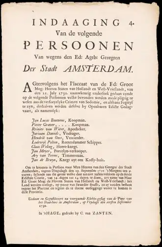 - ^ Rictor Norton, "The Dutch Purge of Homosexuals 1730". Archived 2012-05-18 at the Wayback Machine