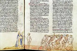Homosexual intercourse between males was possibly denounced in pre-6th century Jewish and Christian writings, such as the Epistle to the Romans or John Chrysostom's fourth homily on Romans[33] and attributed to Sodom by the Jewish philosopher Philo (20 BCE – 50 CE) and the Christian bishop Methodius of Olympus (260–311)[34] and possible by Flavius Josephus (37–100)[35][36][37] Augustine of Hippo, (354–430)[38] and some pseudepigraphacal texts.[39][40][41] The first attested applications of the word "sodomy" to male homosexual intercourse were Emperor Justinian I's amendments to his Corpus iuris civilis; novels no. 77 (dating 538) and no. 141 (dating 559) declared that Sodom's sin had been specifically same-sex activities and desire for them. He also linked "famines, earthquakes, and pestilences" upon cities as being due to "such crimes,"[42][43] during a time of recent earthquakes and other disasters (see Extreme weather events of 535–536). While adhering to the death penalty by beheading as punishment for homosexuality or adultery, Justinian's legal novels heralded a change in Roman legal paradigm in that he introduced a concept of not only secular but also divine punishment for homosexual behavior.