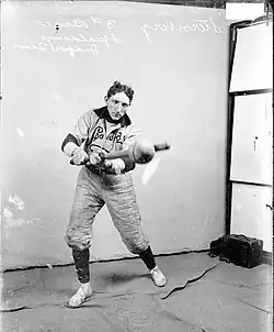 The earliest known softball game was played in Chicago, Illinois, on Thanksgiving Day, 1887. It took place at the Farragut Boat Club at a gathering to hear the outcome of the Yale University and Harvard University football game.[2] When the score was announced and bets were settled, a Yale alumnus threw a boxing glove at a Harvard supporter. The Harvard fan grabbed a stick and swung at the rolled-up glove.[3] George Hancock, a reporter there, called out "Play ball!" and the game began, with the boxing glove tightened into a ball, a broom handle serving as a bat. This first contest ended with a score of 41–40.[4] The ball, being soft, was fielded barehanded.[5][6]