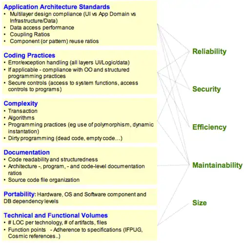 The measurement of critical application characteristics involves measuring structural attributes of the application's architecture, coding, and in-line documentation, as displayed in the picture above. Thus, each characteristic is affected by attributes at numerous levels of abstraction in the application and all of which must be included in calculating the characteristic's measure if it is to be a valuable predictor of quality outcomes that affect the business. The layered approach to calculating characteristic measures displayed in the figure above was first proposed by Boehm and his colleagues at TRW (Boehm, 1978)[67] and is the approach taken in the ISO 9126 and 25000 series standards. These attributes can be measured from the parsed results of a static analysis of the application source code. Even dynamic characteristics of applications such as reliability and performance efficiency have their causal roots in the static structure of the application.