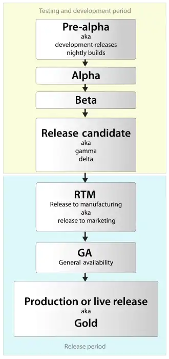 The software release life cycle is the process of developing, testing, and distributing a software product (e.g., an operating system). It typically consists of several stages, such as pre-alpha, alpha, beta, and release candidate, before the final version, or "gold", is released to the public.