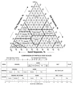 The physical properties of soils, in order of decreasing importance for ecosystem services such as crop production, are texture, structure, bulk density, porosity, consistency, temperature, colour and resistivity.[61] Soil texture is determined by the relative proportion of the three kinds of soil mineral particles, called soil separates: sand, silt, and clay. At the next larger scale, soil structures called peds or more commonly soil aggregates are created from the soil separates when iron oxides, carbonates, clay, silica and humus, coat particles and cause them to adhere into larger, relatively stable secondary structures.[62] Soil bulk density, when determined at standardized moisture conditions, is an estimate of soil compaction.[63] Soil porosity consists of the void part of the soil volume and is occupied by gases or water. Soil consistency is the ability of soil materials to stick together. Soil temperature and colour are self-defining. Resistivity refers to the resistance to conduction of electric currents and affects the rate of corrosion of metal and concrete structures which are buried in soil.[64] These properties vary through the depth of a soil profile, i.e. through soil horizons. Most of these properties determine the aeration of the soil and the ability of water to infiltrate and to be held within the soil.[65]