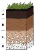 Given sufficient time, an undifferentiated soil will evolve a soil profile that consists of two or more layers, referred to as soil horizons. These differ in one or more properties such as in their texture, structure, density, porosity, consistency, temperature, color, and reactivity.[8] The horizons differ greatly in thickness and generally lack sharp boundaries; their development is dependent on the type of parent material, the processes that modify those parent materials (e.g. mineral weathering), and the soil-forming factors that influence those processes. The biological influences on soil properties (e.g. bioturbation) are strongest near the surface, while the geochemical influences on soil properties increase with depth. Mature soil profiles typically include three basic master horizons: A, B, and C. The solum normally includes the A and B horizons. The living component of the soil is largely confined to the solum, and is generally more prominent in the A horizon.[38] It has been suggested that the pedon, a column of soil extending vertically from the surface to the underlying parent material and large enough to show the characteristics of all its horizons, could be subdivided in the humipedon (the living part, where most soil organisms are dwelling, corresponding to the humus form), the copedon (in intermediary position, where most weathering of minerals takes place) and the lithopedon (in contact with the subsoil).[39]