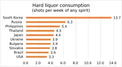 Although beer, whiskey, and wine have been gaining popularity in recent years, soju remains one of the most popular alcoholic beverages in Korea because of its ready availability and relatively low price. More than 3 billion bottles were consumed in South Korea in 2004.[67] In 2006, it was estimated that the average adult Korean (older than 20) had consumed 90 bottles of soju during that year.[68] In 2014, it was reported that South Koreans of drinking age consumed an average of 13.7 shots of spirit per week, the highest per capita consumption of alcoholic spirits of any country.[69] However, due to the lower concentration of alcohol in soju compared to other hard spirits[5] and the lack of an international standard for the volume of a shot, this does not necessarily imply a larger consumption of alcohol from hard spirits.