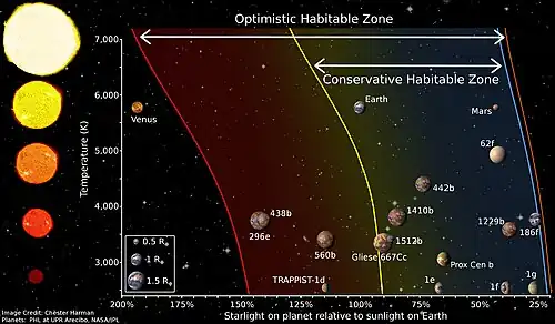The zone of habitability of the Solar System is conventionally located in the inner Solar System around Earth, where atmospheric liquid water is enabled by the Sun.[75]
