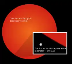 The Sun's main-sequence phase, from beginning to end, will last about 10 billion years for the Sun compared to around two billion years for all other subsequent phases of the Sun's pre-remnant life combined.[37] The Solar System will remain roughly as it is known today until the hydrogen in the core of the Sun has been entirely converted to helium, which will occur roughly 5 billion years from now. This will mark the end of the Sun's main-sequence life. At that time, the core of the Sun will contract with hydrogen fusion occurring along a shell surrounding the inert helium, and the energy output will be greater than at present. The outer layers of the Sun will expand to roughly 260 times its current diameter, and the Sun will become a red giant. Because of its increased surface area, the surface of the Sun will be cooler (2,600 K (4,220 °F) at its coolest) than it is on the main sequence.[37]