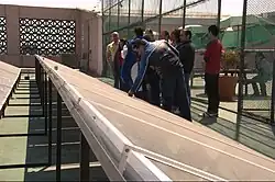 Clothes lines, clotheshorses, and clothes racks dry clothes through evaporation by wind and sunlight without consuming electricity or gas. In some states of the United States legislation protects the "right to dry" clothes.[44] Unglazed transpired collectors (UTC) are perforated sun-facing walls used for preheating ventilation air. UTCs can raise the incoming air temperature up to 22 °C (40 °F) and deliver outlet temperatures of 45–60 °C (113–140 °F).[45] The short payback period of transpired collectors (3 to 12 years) makes them a more cost-effective alternative than glazed collection systems.[45] As of 2003, over 80 systems with a combined collector area of 35,000 square metres (380,000 sq ft) had been installed worldwide, including an 860 m2 (9,300 sq ft) collector in Costa Rica used for drying coffee beans and a 1,300 m2 (14,000 sq ft) collector in Coimbatore, India, used for drying marigolds.[46]