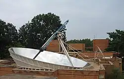 Solar cookers use sunlight for cooking, drying, and pasteurization. They can be grouped into three broad categories: box cookers, panel cookers, and reflector cookers.[38] The simplest solar cooker is the box cooker first built by Horace de Saussure in 1767.[39] A basic box cooker consists of an insulated container with a transparent lid. It can be used effectively with partially overcast skies and will typically reach temperatures of 90–150 °C (194–302 °F).[40] Panel cookers use a reflective panel to direct sunlight onto an insulated container and reach temperatures comparable to box cookers. Reflector cookers use various concentrating geometries (dish, trough, Fresnel mirrors) to focus light on a cooking container. These cookers reach temperatures of 315 °C (599 °F) and above but require direct light to function properly and must be repositioned to track the Sun.[41]