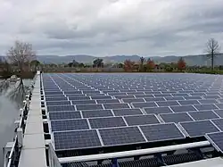 Solar power, also known as solar electricity, is the conversion of energy from sunlight into electricity, either directly using photovoltaics (PV) or indirectly using concentrated solar power. Solar panels use the photovoltaic effect to convert light into an electric current.[63] Concentrated solar power systems use lenses or mirrors and solar tracking systems to focus a large area of sunlight to a hot spot, often to drive a steam turbine.