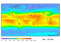 The Earth receives 174 petawatts (PW) of incoming solar radiation (insolation) at the upper atmosphere.[6] Approximately 30% is reflected back to space while the rest, 122 PW, is absorbed by clouds, oceans and land masses. The spectrum of solar light at the Earth's surface is mostly spread across the visible and near-infrared ranges with a small part in the near-ultraviolet.[7] Most of the world's population live in areas with insolation levels of 150–300 watts/m2, or 3.5–7.0 kWh/m2 per day.[8]