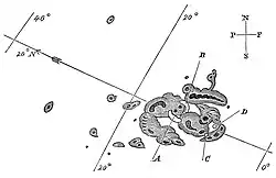 Richard Carrington's sketch of the first recorded solar flare (A and B mark the initial bright points which moved over the course of five minutes to C and D before disappearing.)[50]
