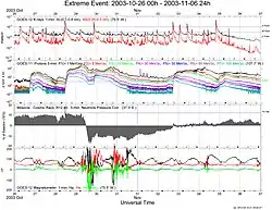 Space weather conditions, including the soft-X-ray flux (top row), during the 2003 Halloween solar storms[56]