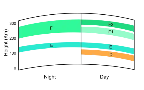 The temporary increase in ionization of the daylight side of Earth's atmosphere, in particular the D layer of the ionosphere, can interfere with short-wave radio communications that rely on its level of ionization for skywave propagation. Skywave, or skip, refers to the propagation of radio waves reflected or refracted off of the ionized ionosphere. When ionization is higher than normal, radio waves get degraded or completely absorbed by losing energy from the more frequent collisions with free electrons.[2][36]