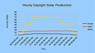 Module performance is generally rated under standard test conditions: irradiance of 1,000 W/m2, solar spectrum of AM 1.5 and module temperature at 25 °C.[59] The actual voltage and current output of the module changes as lighting, temperature and load conditions change, so there is never one specific voltage at which the module operates. Performance varies depending on geographic location, time of day, the day of the year, amount of solar irradiance, direction and tilt of modules, cloud cover, shading, soiling, state of charge, and temperature. Performance of a module or panel can be measured at different time intervals with a direct current clamp meter or shunt and logged, graphed, or charted with a chart recorder or data logger.