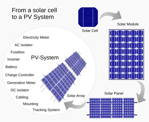 A single solar panel can produce only a limited amount of power; most installations contain multiple panels adding their voltages or currents. A photovoltaic system typically includes an array of photovoltaic modules, an inverter, a battery pack for energy storage, a charge controller, interconnection wiring, circuit breakers, fuses, disconnect switches, voltage meters, and optionally a solar tracking mechanism. Equipment is carefully selected to optimize energy output and storage, reduce power transmission losses, and many times convert from direct current to alternating current.