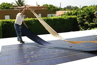 Photovoltaic modules consist of a large number of solar cells and use light energy (photons) from the Sun to generate electricity through the photovoltaic effect. Most modules use wafer-based crystalline silicon cells or thin-film cells. The structural (load carrying) member of a module can be either the top layer or the back layer. Cells must be protected from mechanical damage and moisture. The cells and modules are usually connected electrically in series, one to another to increase the desired voltage output, and then in parallel to increase current output to create the solar panel. Most panels are rigid, but semi-flexible ones based on thin-film cells are also available. The power (in watts) of the solar panel is the voltage (in volts) multiplied by the current (in amperes), and depends both on the amount of light and on the electrical load connected to the panel. The manufacturing specifications on solar panels are obtained under standard conditions, which are usually not the true operating conditions the solar panels are exposed to on the installation site.[18] A PV junction box is attached to the back of the solar panel and functions as its output interface. External connections for most photovoltaic modules use MC4 connectors to facilitate easy weatherproof connections to the rest of the system. A USB power interface can also be used.[19]