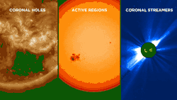CMEs are not the only cause of space weather. Different patches on the Sun are known to give rise to slightly different speeds and densities of wind depending on local conditions. In isolation, each of these different wind streams would form a spiral with a slightly different angle, with fast-moving streams moving out more directly and slow-moving streams wrapping more around the Sun. Fast-moving streams tend to overtake slower streams that originate westward of them on the Sun, forming turbulent co-rotating interaction regions that give rise to wave motions and accelerated particles, and that affect Earth's magnetosphere in the same way as, but more gently than, CMEs.