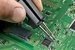 For attachment of electronic components to a PCB, proper selection and use of flux helps prevent oxidation during soldering; it is essential for good wetting and heat transfer. The soldering iron tip must be clean and pre-tinned with solder to ensure rapid heat transfer.