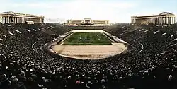 On December 3, 1919, Chicago-based architectural firm Holabird & Roche was chosen to design the stadium,[14] which broke ground on August 11, 1922.[15] The stadium cost $13 million to construct (equivalent to $240 million in 2024), a large sum for a sporting venue at that time (in comparison, the Los Angeles Memorial Coliseum had cost less than US$1 million in 1923 dollars). On October 9, 1924, the 53rd anniversary of the Great Chicago Fire, the stadium was officially dedicated as "Grant Park Stadium",[16] although it had hosted a few events before then, including a field day for Chicago police officers on September 6, and the stadium's first football game, between Louisville Male High School and Austin Community Academy High School, on October 4.[14] On November 22, the stadium hosted its first college football game, in which Notre Dame defeated Northwestern University 13–6.[14]